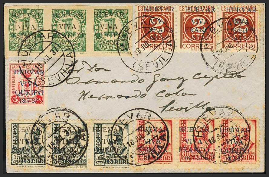 44, 47, 48, 49. 1937. 1 cts green, 2 cts red chestnut, 15 cts slate and 30 cts carmine, triptychs with the three legends and charity 5 cts red with the same surcharge. EGG to SEVILLE. MAGNIFICENT.