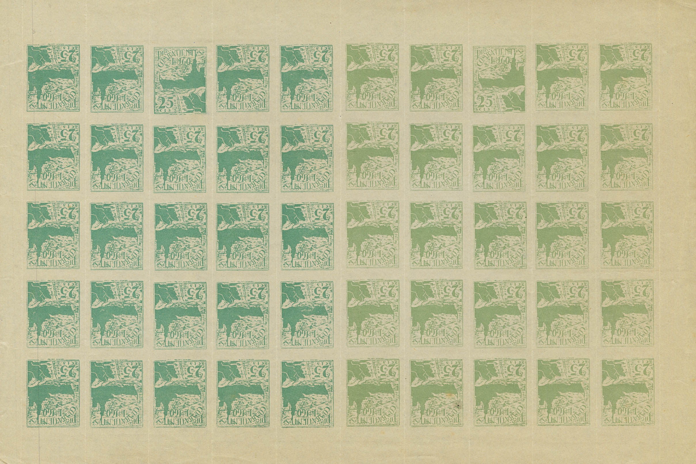 English (★)1937. 25 cts olive green and light green, full sheet of fifty stamps. LUGO. Half in one color and the other half in another, includes a TETE-BECHE pair in each color. MAGNIFICENT AND VERY RARE COMPLETE SHEET. (Allepuz 58)