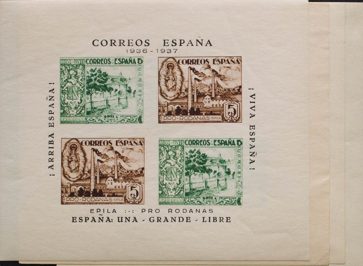 ★1937. Set of four block sheets of EPILA, 5 cts green + 5 cts chestnut, 5 cts blue + 5 cts pink and PRO AVION 5 cts blue + 5 cts pink with black and blue surcharges. MAGNIFICENT. (Fesofi 5, 5B, 11, 12 and Allepuz 22, 24, 27, 28)