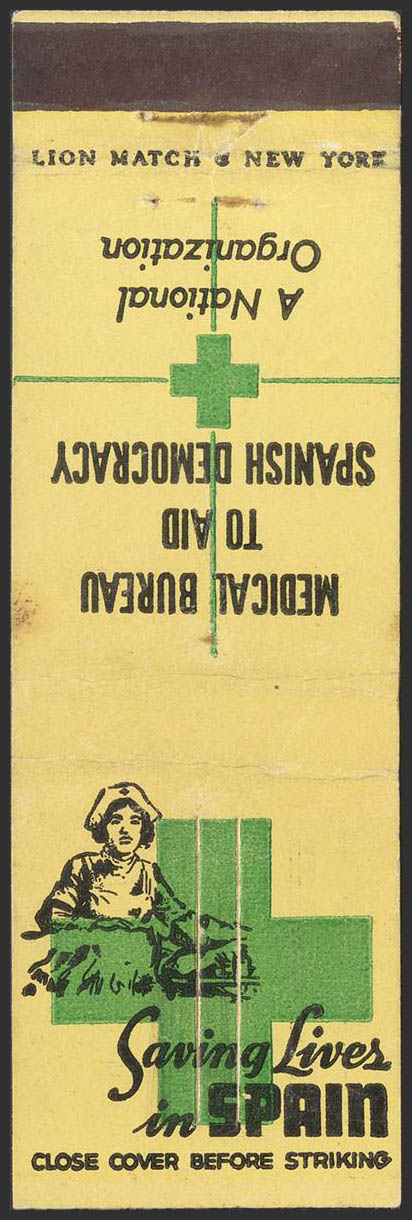△(1936ca). Matchbox. MEDICAL BUREAU TO AID SPANISH DEMOCRACY, A NATIONAL ORGANIZATION, SAVING LIVES IN SPAIN, printed in New York to raise funds for American hospitals in Spain during the Civil War. MAGNIFICENT AND VERY RARE.