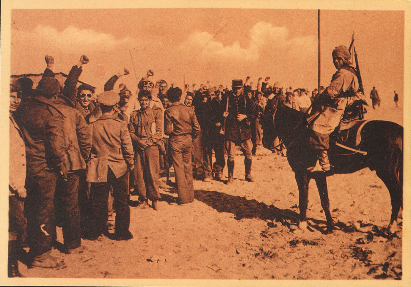 (★)(1939ca). Illustrated Postcard (unused) of the Argeles Sur Mer Refugee Camp (refugees queuing). MAGNIFICENT AND RARE.