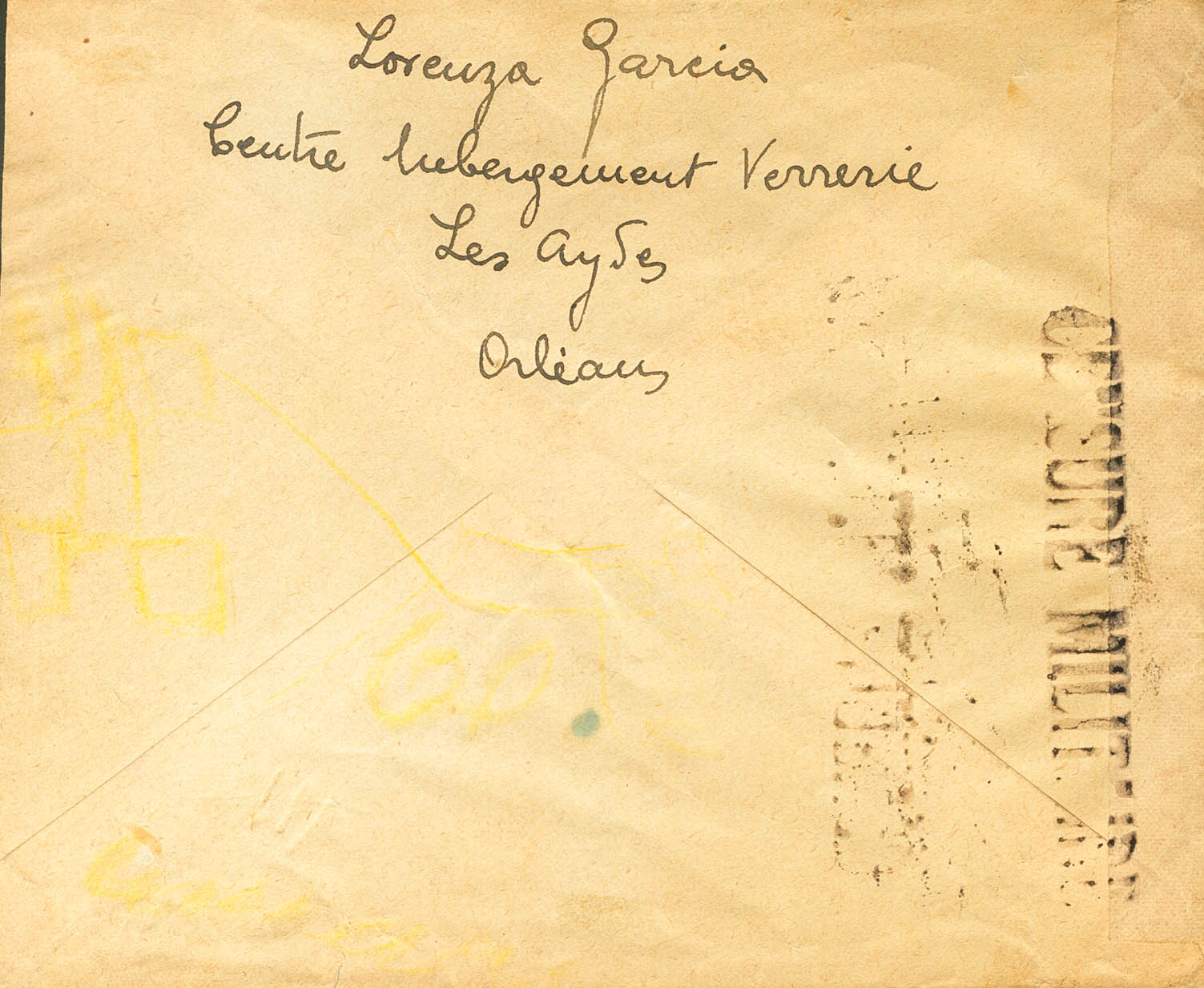 |ABOUT|1939. 90 cts blue from France, overprint F. LES AYDES to GURS, sent by a Spanish refugee from the Temporary Accommodation Centre of Verrerie de Les Aydes (Orléans), a former glass factory converted into a reception centre and addressed to the Camp. MAGNIFICENT AND VERY RARE ORIGIN, ESPECIALLY RARE ADDRESSED TO ANOTHER REFUGEE CAMP.