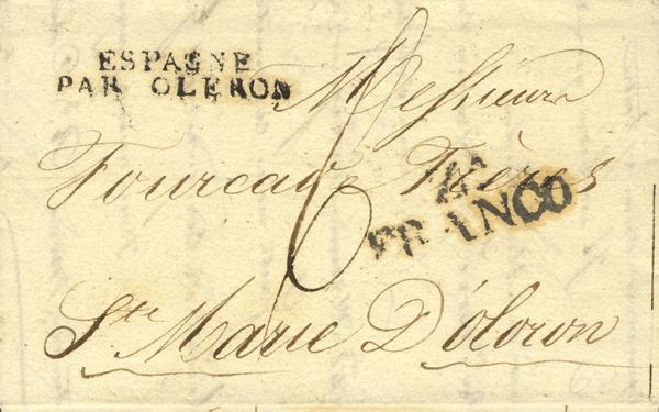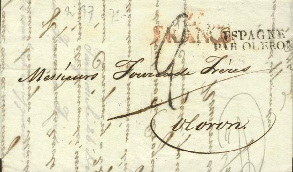 1828. ZARAGOZA to OLORON. Zª / FRANCO brand, in black (PE 27). MAGNIFICENT AND RARE.