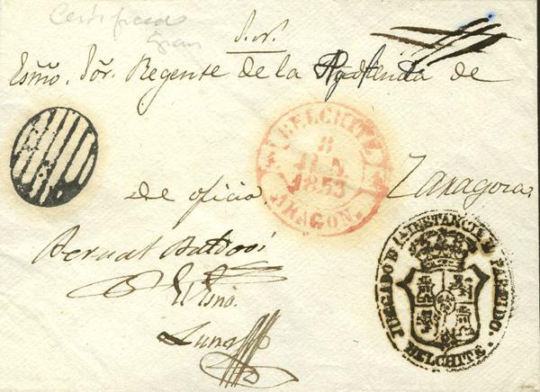 1853. BELCHITE to ZARAGOZA. Mark GRILL, indicating that the letter circulated free, on the front baeza BELCHITE / ARAGON and mark COURT OF FIRST INSTANCE OF THE PARTY / BELCHITE. MAGNIFICENT AND RARE. Certificate GRAUS.