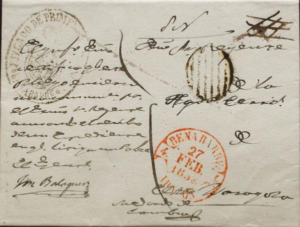 1852. BENABARRE (HUESCA) to ZARAGOZA. PARRILLA brand, used as a franchise indicating that the letter circulated free of postage and JUZGADO DE FIRST INSTANCIA / BENABARRE brand. MAGNIFICENT AND RARE.