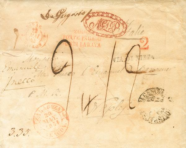 1835. ZARAGOZA to OLORON. Zª / FRANCO brand, in red (PE 28). MAGNIFICENT AND VERY RARE.