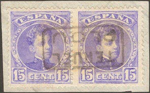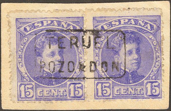 245(2). 1901. 15 cts violet, pair on fragment. Mail postmark TERUEL / POZONDON. MAGNIFICENT.