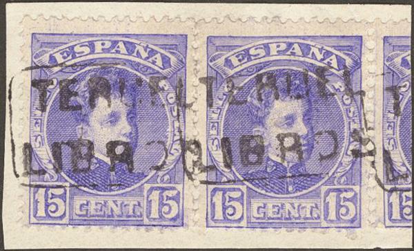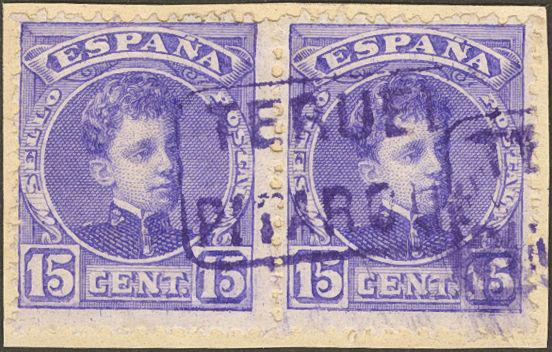 245(2). 1901. 15 cts violet, pair on fragment. Mail postmark TERUEL / BOOKS. MAGNIFICENT.