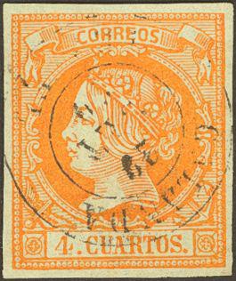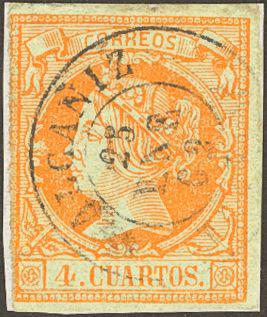 52. 1860. 4 orange cuartos . Postmark CALAMOCHA / TERUEL. MAGNIFICENT.