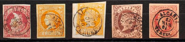 48, 52(2), 58, 64. (1855ca). Set of five 4- cuartos red, yellow, brown and pink stamps, unused with the ALCAÑIZ / TERUEL postmark (including Type I on the 4- cuartos red and yellow). MAGNIFICENT.