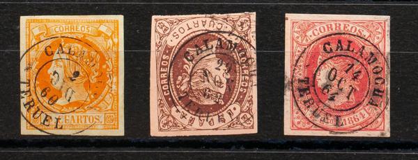 52, 58, 64. (1860ca). Set of three 4- cuartos yellow, brown and pink stamps, unused with the CALAMOCHA / TERUEL postmark. MAGNIFICENT.
