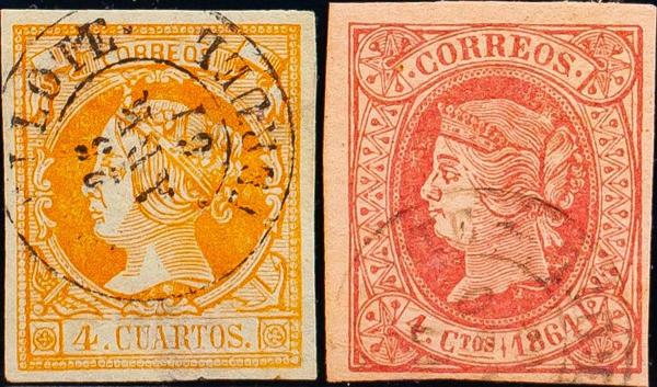 48, 52. 1855. Set of two stamps of 4 cuartos red and 4 cuartos yellow, unused with the TORREMOCHA / TERUEL postmark (both Type I). MAGNIFICENT.