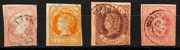 48, 52, 58, 64. (1855ca). Set of four stamps of the 4- cuartos red, yellow, brown and pink, unused with HIJAR / TERUEL postmark (Type I in the 4- cuartos red). MAGNIFICENT.