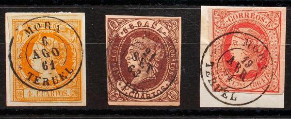 52, 58, 64. (1860ca). Set of three 4- cuartos yellow, brown and pink stamps, unused with the MORA / TERUEL postmark. MAGNIFICENT.
