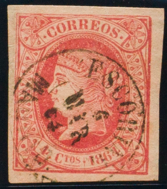 64. 1864. 4 red cuartos . ESCORIAL / MADRID postmark. MAGNIFICENT AND RARE.