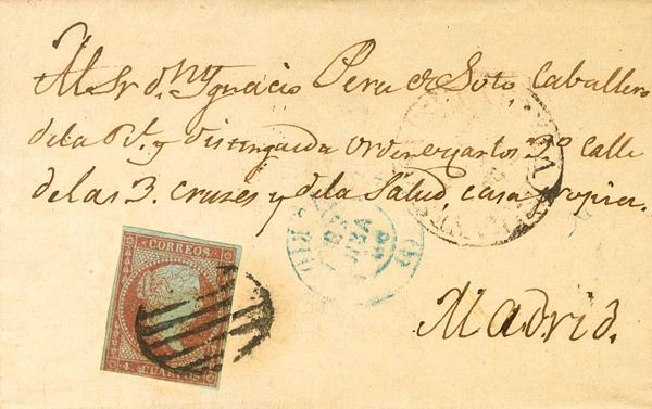 |ABOUT| 40. 1856. 4 carmine red quarters. LANESTOSA to MADRID. On the front Baeza LANESTOSA / VIZCAYA, in black (very weak). MAGNIFICENT AND VERY RARE LATE USE OF THE BAEZA TYPE DATE STAMP.