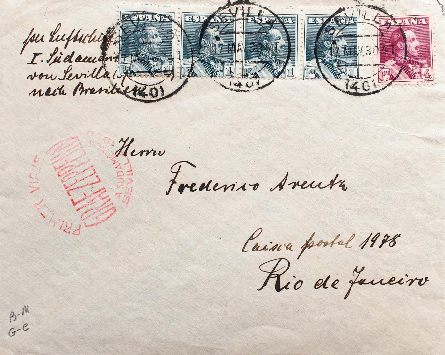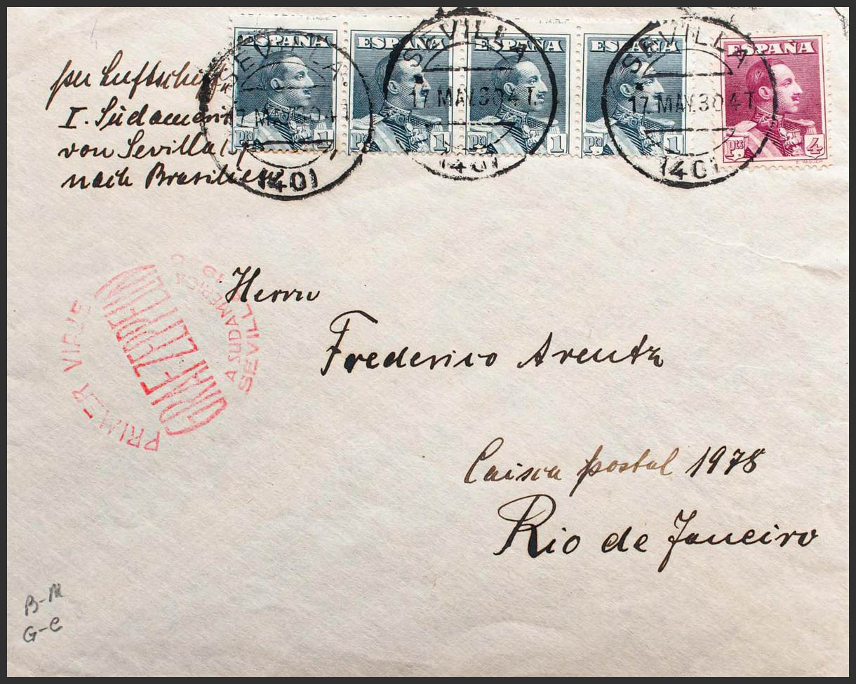 321(4), 322. 1930. 1 pts slate, four stamps and 4 pts violet carmine. Graf Zeppelin from SEVILLE to RIO DE JANEIRO (BRAZIL). On the front it marks FIRST VOYAGE / GRAF ZEPPELIN / TO SOUTH AMERICA / SEVILLE 1930, in red and on the back arrival. MAGNIFICENT.