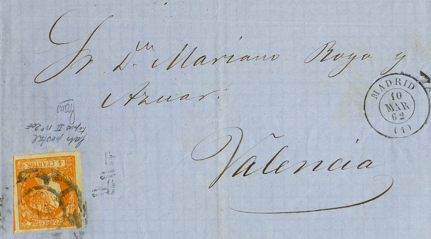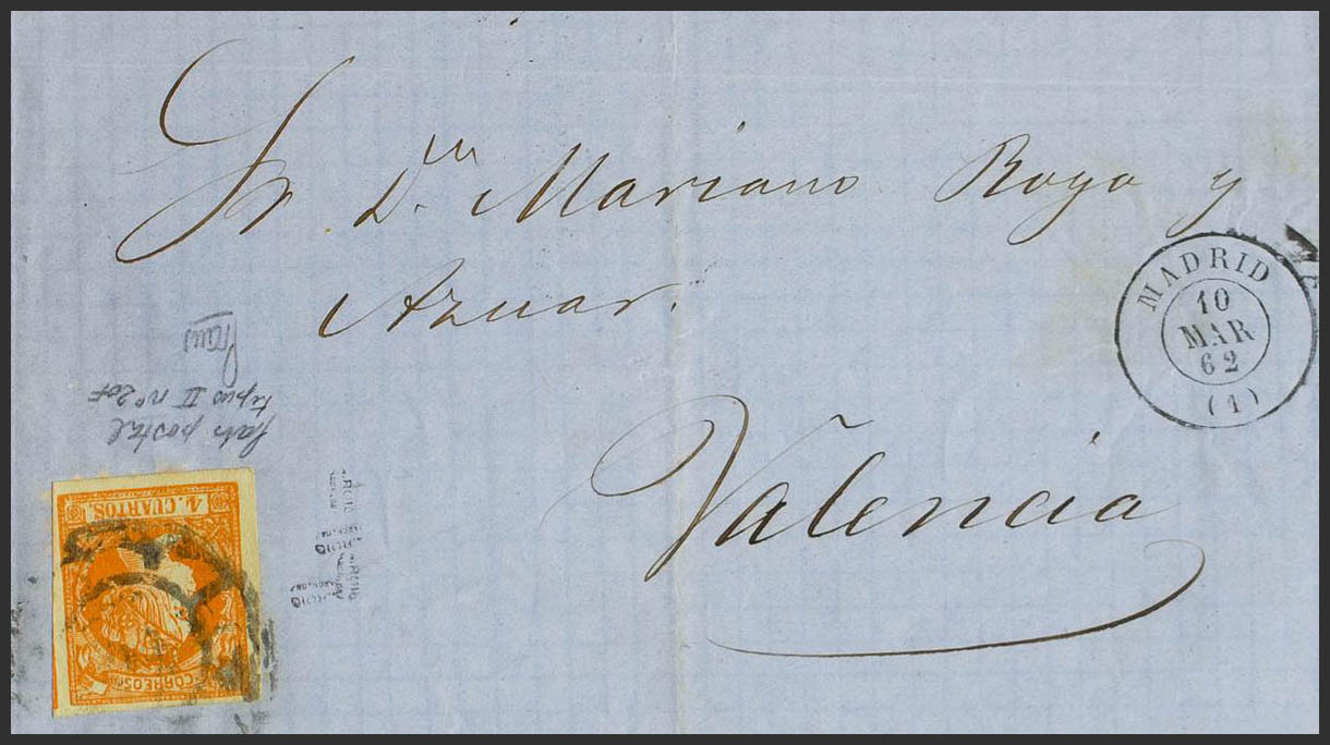 52F. 1862. 4 orange cuartos FALSE POSTCARD TYPE I. MADRID to VALENCIA. MAGNIFICENT.