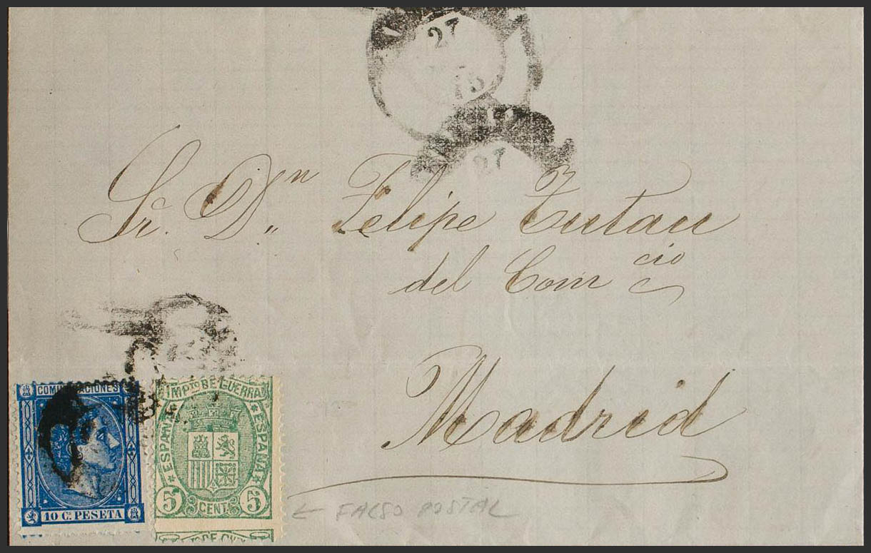 154F, 164. 1875. 5 cts green FALSE POSTCARD UNIQUE TYPE and 10 cts blue. BARCELONA to MADRID. MAGNIFICENT.