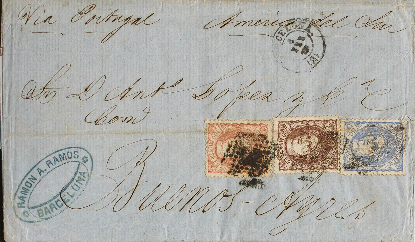 English 108F, 107, 109. 1872. 100 mils chestnut red FALSE POSTAL TYPE II, 50 mils ultramarine and 200 mils chestnut. BARCELONA to BUENOS AIRES (ARGENTINA) (file fold), circulated via Portugal with the rate of 350 mils. MAGNIFICENT AND EXTRAORDINARILY RARE POSTAGE WITH A FAKE POSTAL ADDRESSED TO ARGENTINA.
