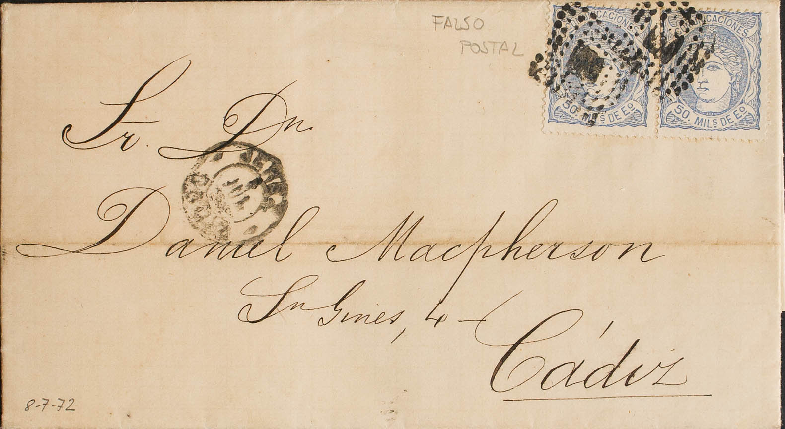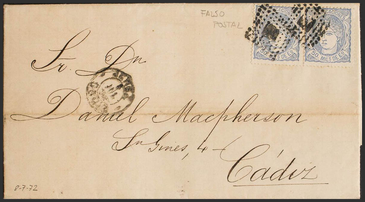 107F(2). 1872. 50 mils overseas FALSE POSTCARD TYPE IX, pair. JEREZ DE LA FRONTERA to CADIZ. MAGNIFICENT AND RARE DOUBLE CARGO CIRCULATED WITH FAKE POSTCARDS.