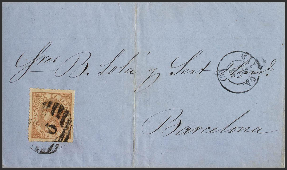 96F. 1868. 50 mils light brown FALSE POSTCARD TYPE III. MALAGA to BARCELONA. MAGNIFICENT AND RARE CIRCULATED IN LETTER.