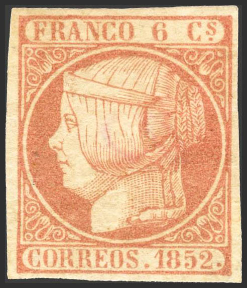 ★ 12. 1852. 6 pink cuartos . Huge margins. MAGNIFICENT. Cert. EMF.
