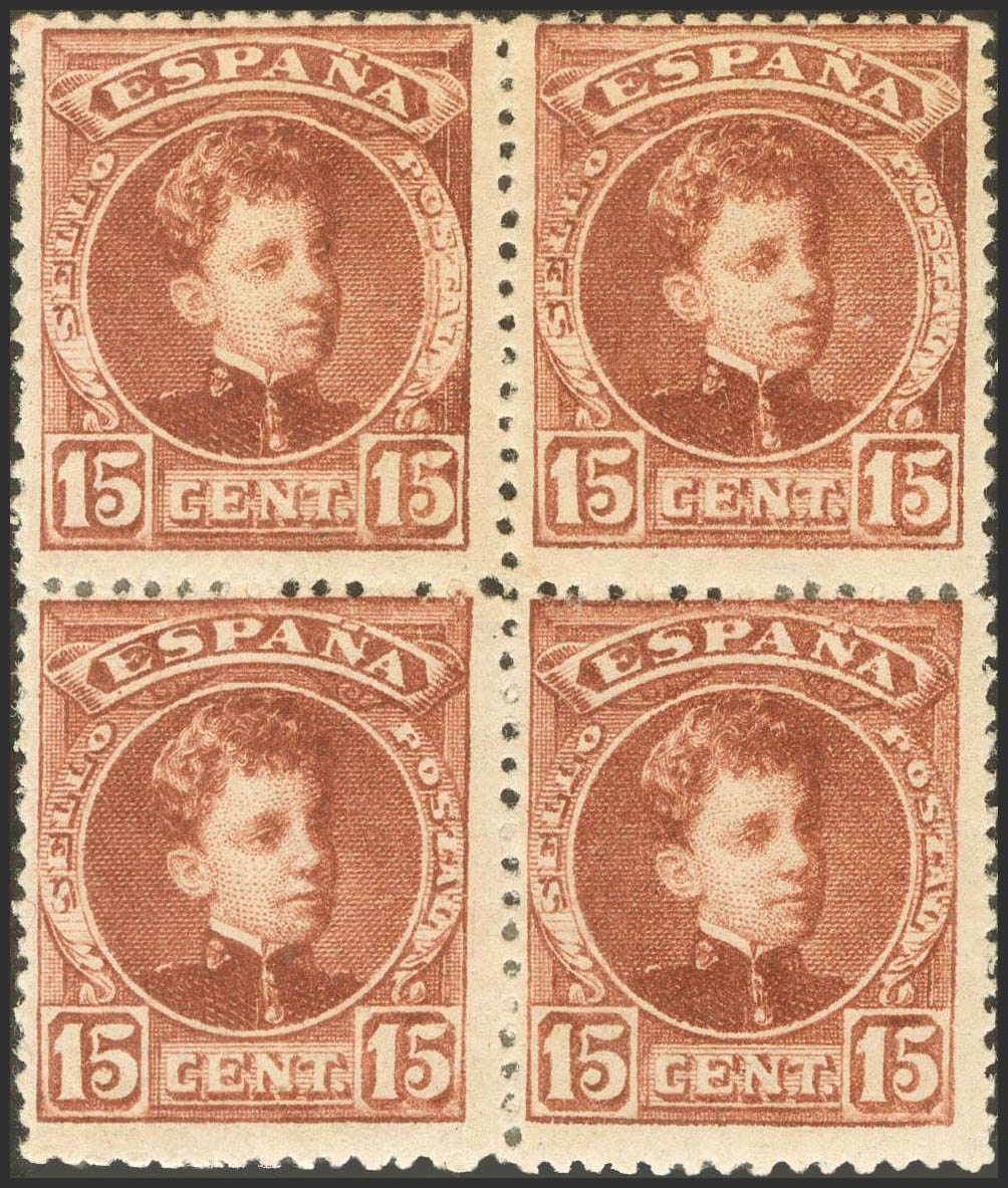 ★★/★ NE11(4). 1901. 15 cts chestnut, block of four (fixes only the upper stamps). NOT ISSUED. MAGNIFICENT AND EXTRAORDINARY RARE IN BLOCK OF FOUR. Cert. GRAUS. Ex-Guerin. Edifil 2024: +++8,760 Euros