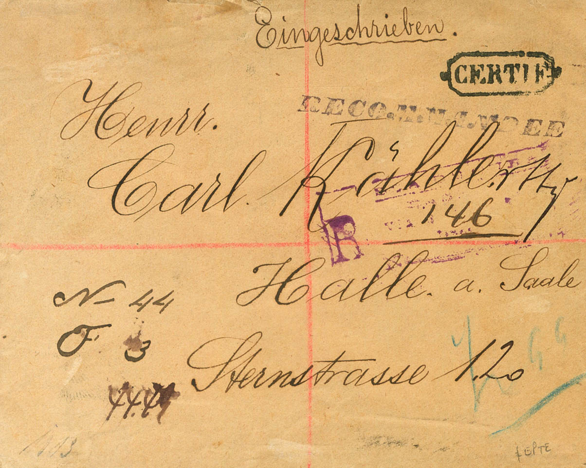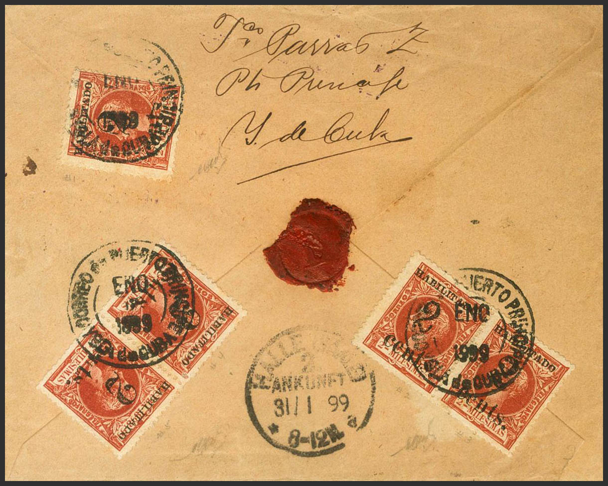 2(4), 2A. 1899. 2 cts on 2 mils brown yellow 1st DRAW, five stamps franked on the back and used as a closure (this is the fractional strip of five). Certificate from PORT-PRINCE to HALLE-SAALE (GERMANY), sent by Francisco Parras, Postmaster of the city and well-known collector, to whom we owe most of the letters in this issue. Postmark CORREO DE PUERTO PRINCIPE / YSLA DE CUBA, on the front three certificate marks, one applied in transit through Havana and arrival on the back. MAGNIFICENT AND UNIQUE KNOWN WITH THE FIVE TYPES OF THE 1ST PRINTING, A PIECE OF ENORMOUS INTEREST AND WHICH HISTORICALLY HAS BEEN PART OF THE GREAT COLLECTIONS OF PORT-AU-PRINCE. Ex-Tows, Robertson, Brock, Kouri and Thompson. Cert. ECHENAGUSIA.
