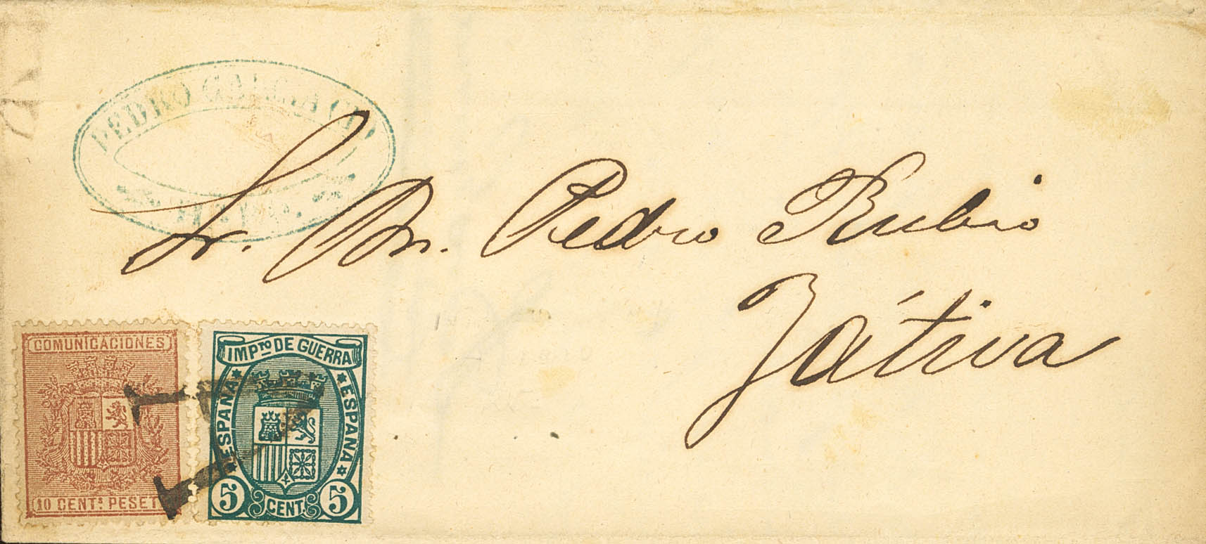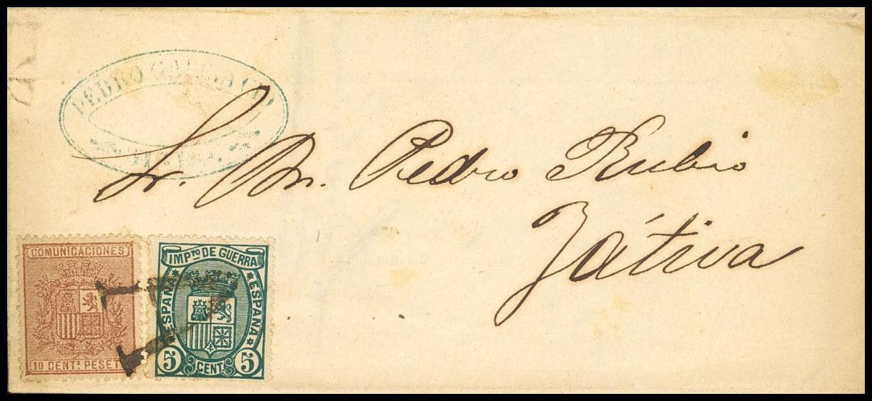 English |COVER| 153, 154. 1875. 10 cts brown and 5 cts dark green. HARO (LA RIOJA) to JATIVA. "A" postmark, Haro season ticket. MAGNIFICENT AND VERY RARE, SPECTACULAR PRINTING.