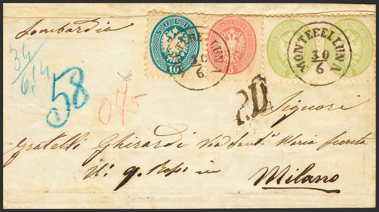 Yvert 24(2), 25, 26. 1864. 3s green, pair, 5s pink, and 10s blue (archival fold). MONTEBELLUNA to MILAN. Date postmark MONTEBELLUNA. BEAUTIFUL AND SPECTACULAR TRICOLOR POSTAGE. (Sassone 42(2), 43, 44 Edition 2005: 7000 Euros)