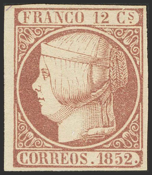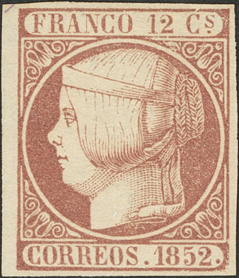 (★) 13. 1852. 12 lilac cuartos , leaf edge. Huge margins and very sharp color. LUXURY PIECE. Certificate COMEX and EXFIMA.