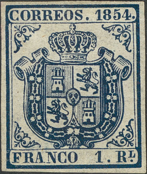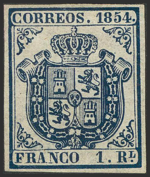 (★) 34. 1854. 1 real azul oscuro. Color excepcional y grandes márgenes. PIEZA DE LUJO Y DE ENORME BELLEZA. Cert. COMEX.