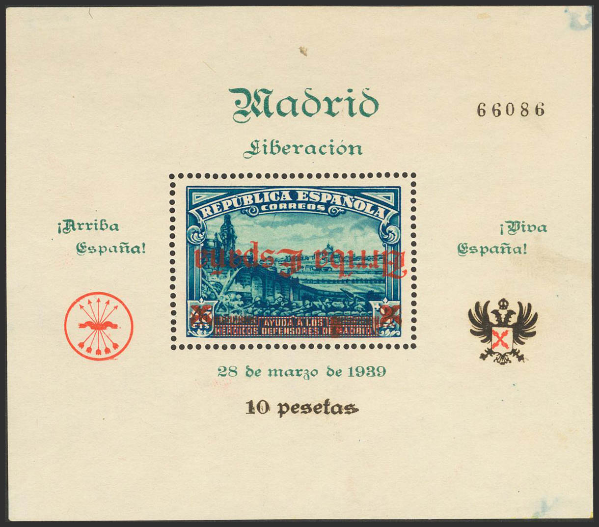 (★) 54C. 1939. Block sheet (usual conservation). Variety OVERLOAD "UP SPAIN" INVERTED. MAGNIFICENT AND EXTRAORDINARILY RARE, VERY PROBABLY UNIQUE KNOWN, THIS IS THE FIRST TIME WE OFFER IT. Certificate CEM.