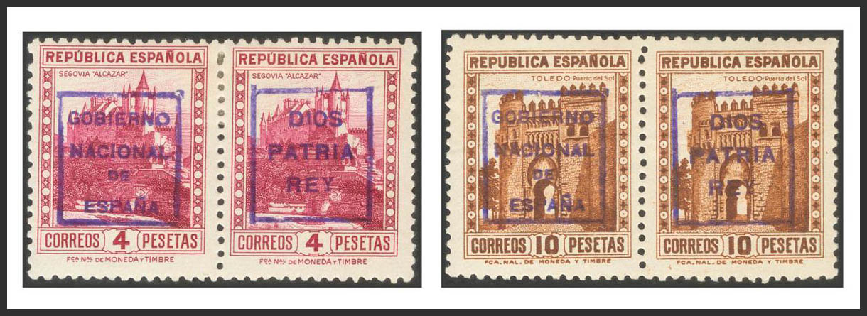 ★ 13/14, 27/28. 1937. 4 lilac carmine sts and 10 chestnut sts, even with the two types of overloads. MAGNIFICENT AND EXTRAORDINARILY RARE. Certificate GRAUS.