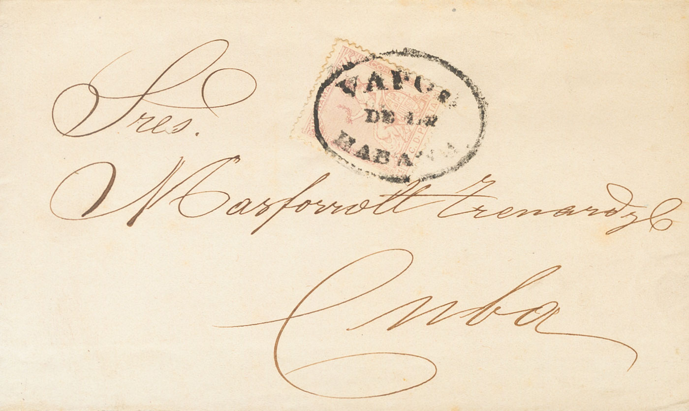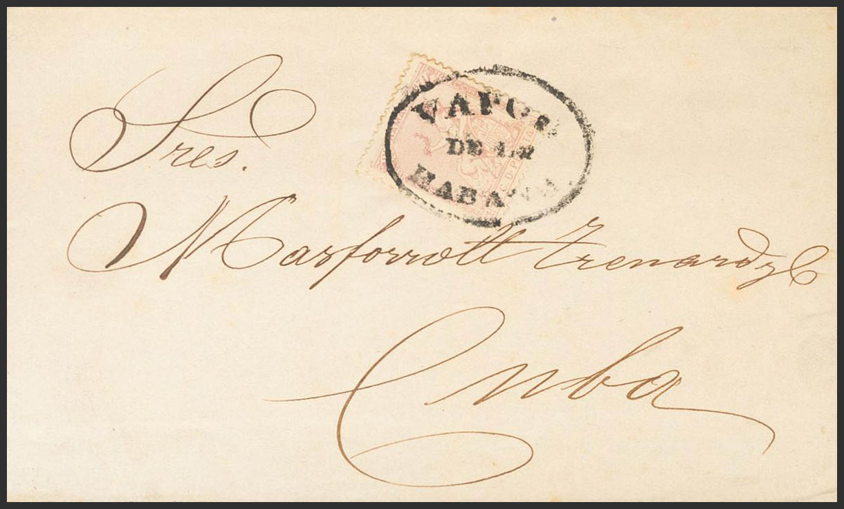 25. 1872. 12 cts lilac. HAVANA to SANTIAGO. Postmark STEAM / DE LA / HAVANA. MAGNIFICENT AND EXTRAORDINARILY RARE USE OF THIS POSTMARK.