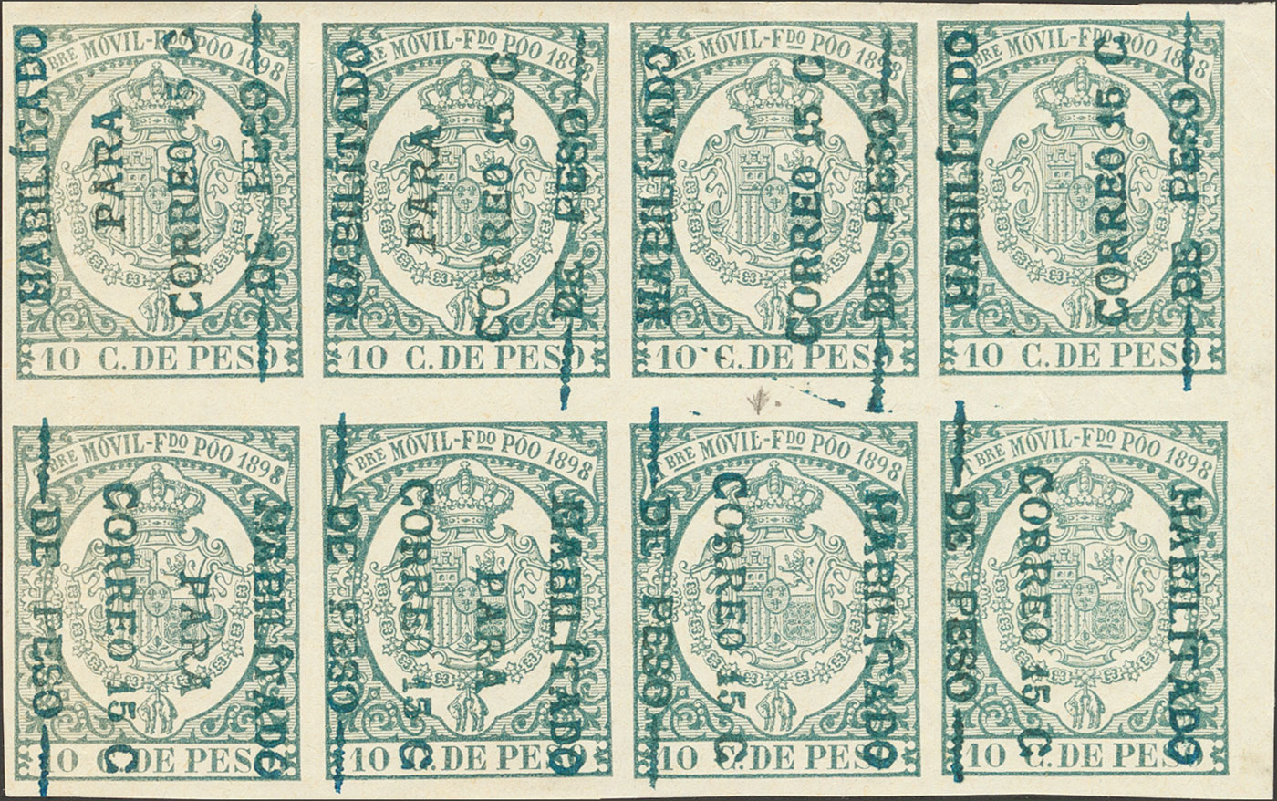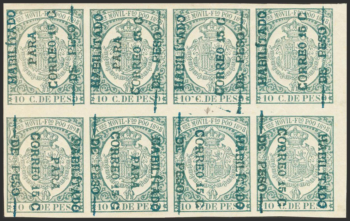 ★★/★ 43a(4), 43d(4). 1898. 15 cts over 10 cts green, block of eight (some minor fold). The upper strip VERTICAL ENABLEMENT FROM BOTTOM TO UP and the lower strip VERTICAL ENABLEMENT FROM TOP TO DOWN. MAGNIFICENT, RARE AND VERY SPECTACULAR. Building 2018: Edifil Euros
