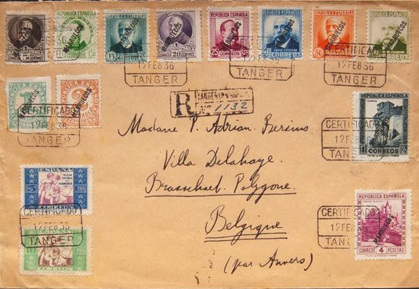 70/76, 78/82. 1936. Complete series, in the absence of 30 cts, 10 pts and 20 urgent cts. Certificate from TANGIER to BELGIUM. MAGNIFICENT AND RARE.