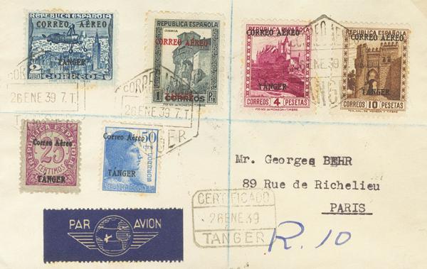 128/33, 135, 137/39, 141. 1939. Complete series, in the absence of 40 cts, 50 cts and 10 pts (some with overload varieties). Certificate from TANGIER to PARIS (FRANCE). On the back arrival. MAGNIFICENT AND RARE.