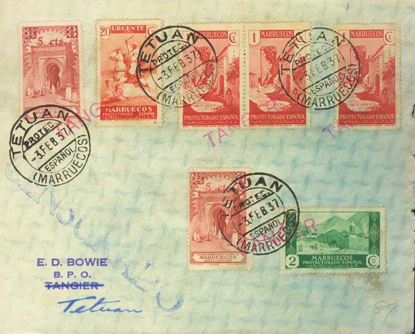 CN1, CN20(2). 1937. 1 cts red, three stamps, 2 cts green, 20 cts red and 5 cts over 25 cts red, two stamps, all values ​​with the TANGER mark of the NATIONAL MAIL (on arrival). TANGER to TETOUAN. BEAUTIFUL AND RARE, THE VALUES OF 1 CTS AND 20 CTS ARE NOT REVIEWED.