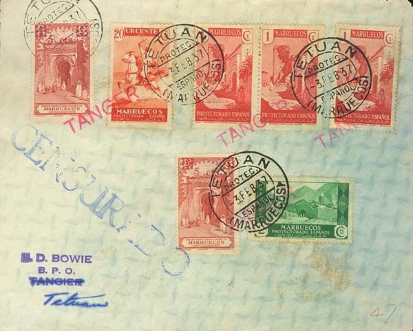 CN1, CN20(2). 1937. 1 cts red, three stamps, 2 cts green, 20 cts red, and 5 cts over 25 cts red, two stamps, all values marked TANGER by CORREO NACIONAL (on arrival). TANGIER to TETOUAN. BEAUTIFUL AND RARE, THE VALUES OF 1 CTS AND 20 CTS ARE NOT LISTED.