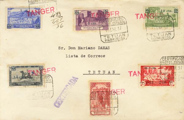 CN2(2), CN3(2), CN18/20(2). 1937. Various values (toned), all values with the TANGER mark of the NATIONAL POST (on arrival). Certificate from TANGIER to TETUAN. BEAUTIFUL AND RARE POSTAGE.