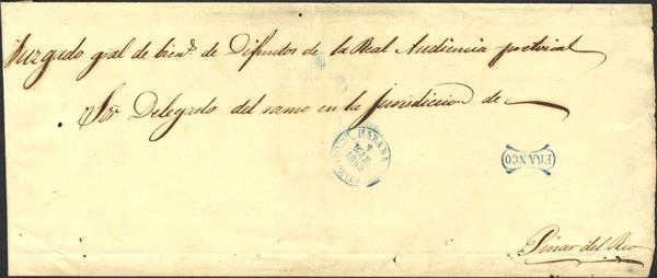 1855. Judicial Escrow from HAVANA to PINAR DEL RIO. Baeza HAVANA / ISLAND OF CUBA, in blue (PE14) and FRANCO brand, in blue (PE19) 2004 edition. MAGNIFICENT.