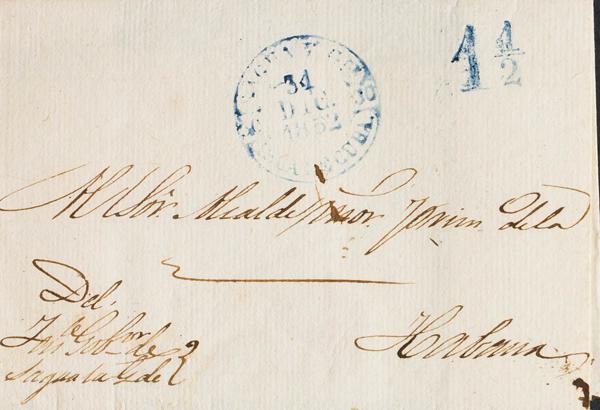 41. (1855ca). 1 real blue (fair margin). CADIZ to HAVANA. On the front portage mark "½" (real) in blue, corresponding to the part charged by the Captain of the Ship and manuscript "Vapor Correo Bird of the Ocean". MAGNIFICENT AND RARE.