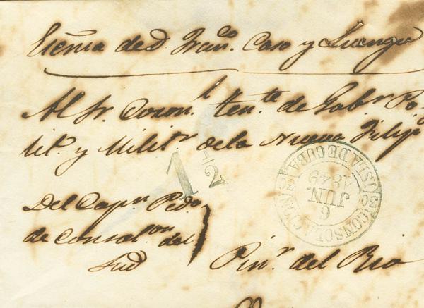 1851. NEW GERONA to BEJUCAL. Official mark (eroded) and baeza NVA.JERONA / ISLA DE CUBA, transported by one of the Batabano steamers. BEAUTIFUL AND RARE. Certificate CEM.