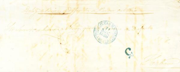 1850. CARDENAS to HAVANA. Baeza CARDENAS / ISLAND OF CUBA, in blue. MAGNIFICENT.