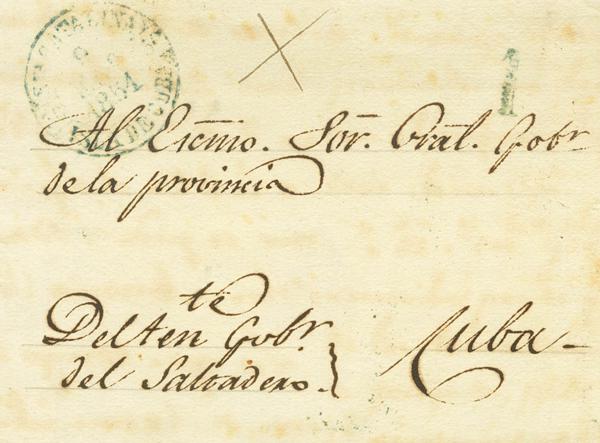 |ABOUT|1849. SANTIAGO DE CUBA to SALTADERO. Baeza S.TIAGO DE CUBA / ISLAND OF CUBA, in blue. MAGNIFICENT.