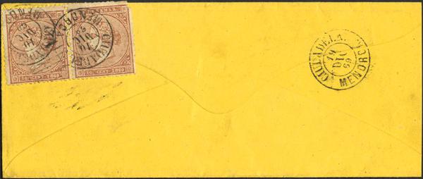 Ant 16(2). 1869. 10 cts brown, pair, franked on the back. CUBA to CITADEL. Postmark CIUDADELA / MENORCA, upon arrival. MAGNIFICENT.