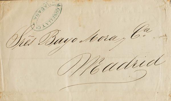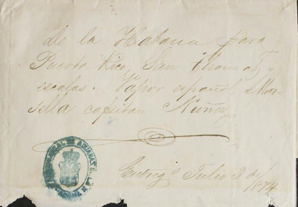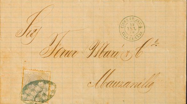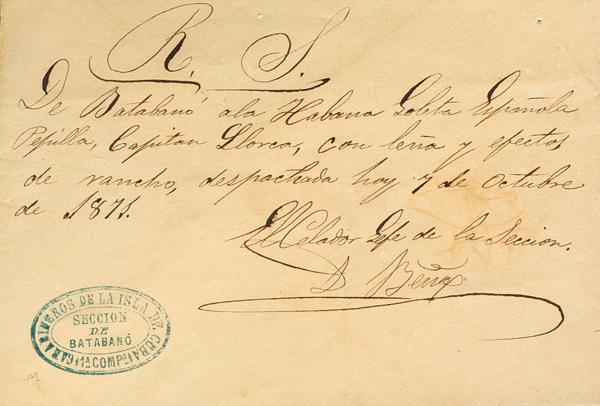 1871. Registration of Shipment from BATABANO to HAVANA. Mark CARABINEROS DE LA ISLA DE CUBA / SECCION / DE / BATABANO / 1ª COMPª, in blue. MAGNIFICENT AND RARE.