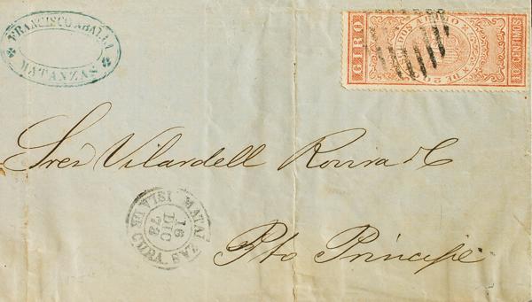 1873. 10 chestnut cts FISCAL TURN. MATANZAS (CUBA) to PORT-AU-PRINCE. On the back handwritten "Guaranteed by Aurelio Ferrer", validating the tax stamp in its use as a postage stamp. MAGNIFICENT AND RARE. Certificate GRAUS.